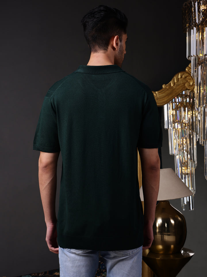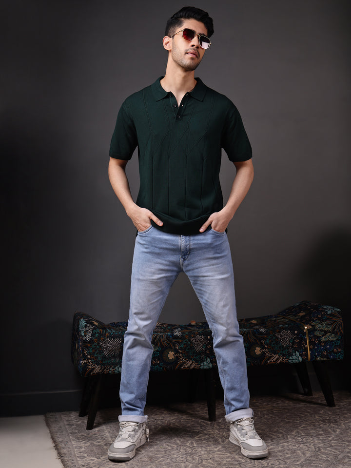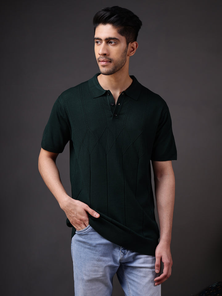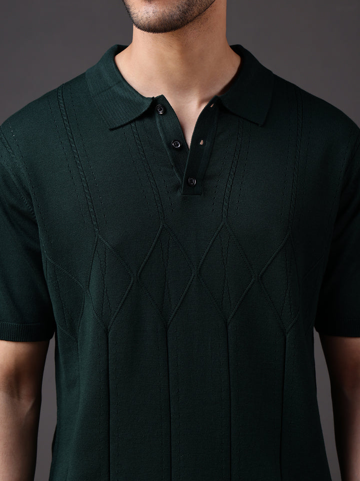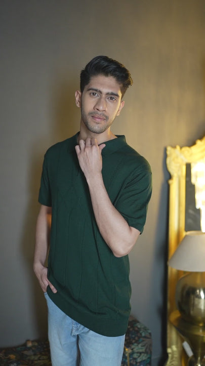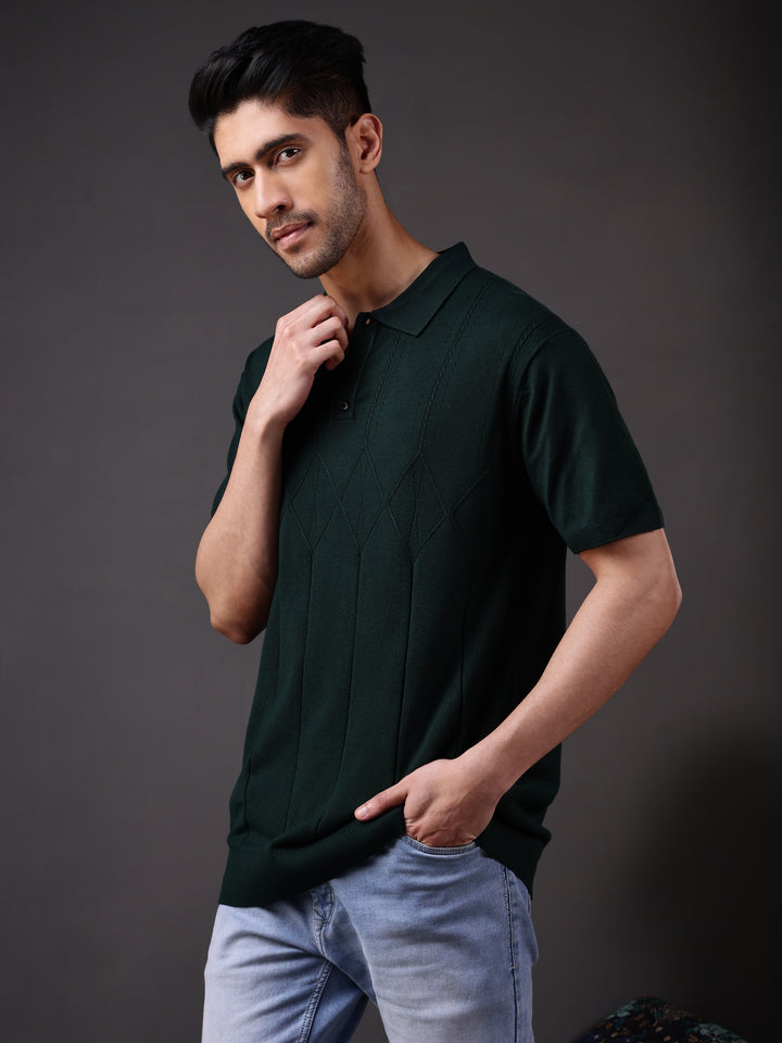 Vogue93 Collar Half Sleeve Knitted Polo Deep Green Geometric