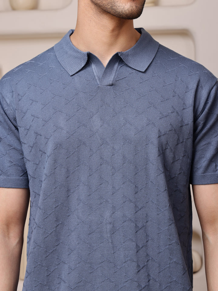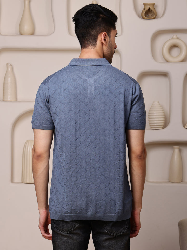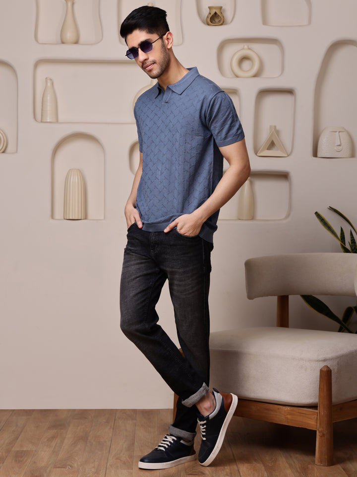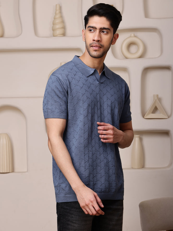 Vogue93 Collar Half Sleeve Knitted Polo Slate Blue Diamond